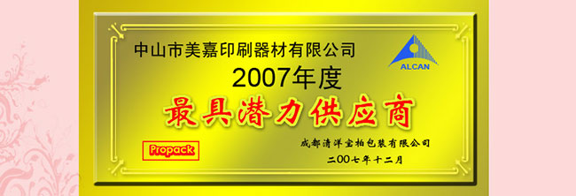 2007年12月,榮獲 ALCAN 集團成都清揚寶柏公司2007年度“最具潛力供應商獎”